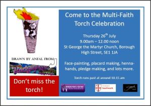 Don’t miss the Torch! Community events, peace pledges, drums, face painting and much more in Hackney on 21st July and in Southwark on 26th July.