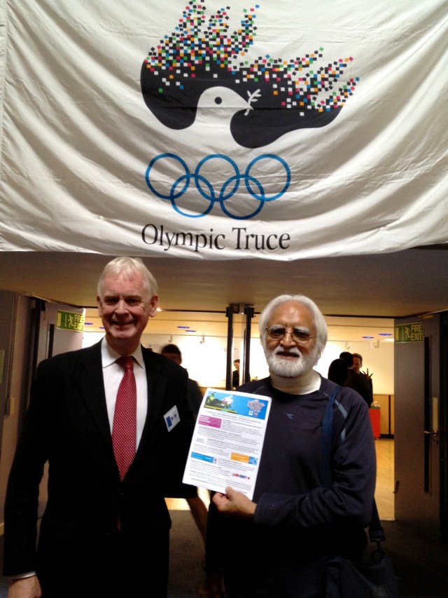 Truce campaigners David Wardrop of UNA Westminster and Gurbakhsh Garcha of UNA Lewisham holding the latest London Peace Network flyer under the Olympic Truce flag today.