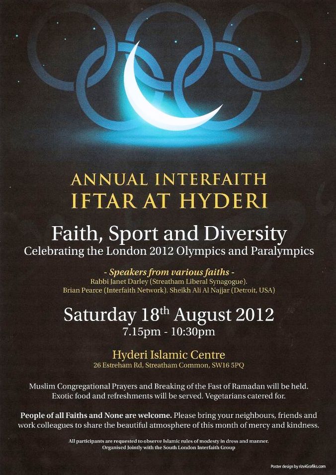 People of all faiths and of none are welcome to join members of the Hyderi Islamic Centre, London SW16, on Saturday 18 August at 7.15pm to break the fast of Ramadan and to hear from