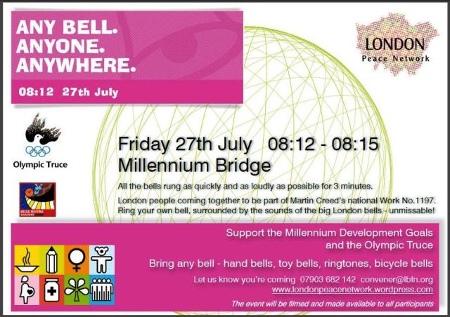 The London Evening Standard reported 150 people ringing bells for the Olympic Truce and Millennium Development Goals with the London Peace Network yesterday. We were part of Martin Creed’s Work No 1197, All The Bells.