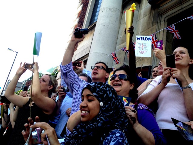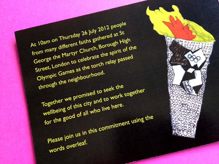 There was a bustle of flags, banners and torches being made as the Torch Relay approached Borough High Street, SE1 on Thursday – people from different religious traditions were busy putting the finishing touches to their work. Faces were painted, hands were decorated with henna.
